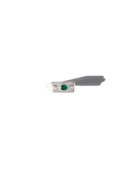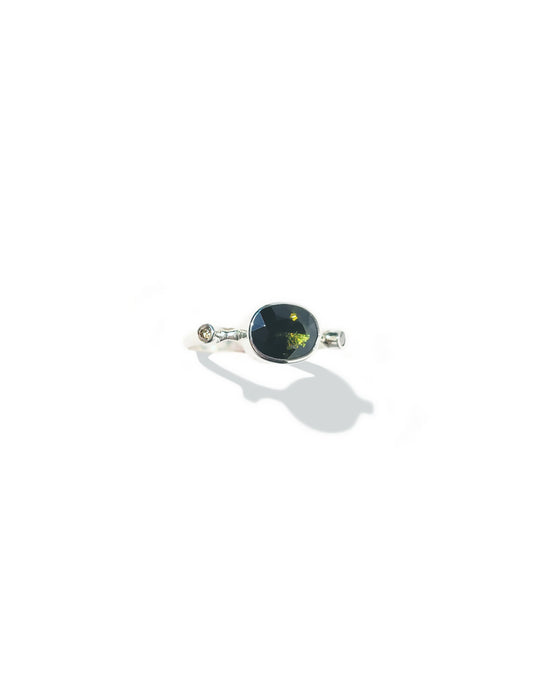 Faceted Square Cut Green Tourmaline & Diamond Silver Flower Ring